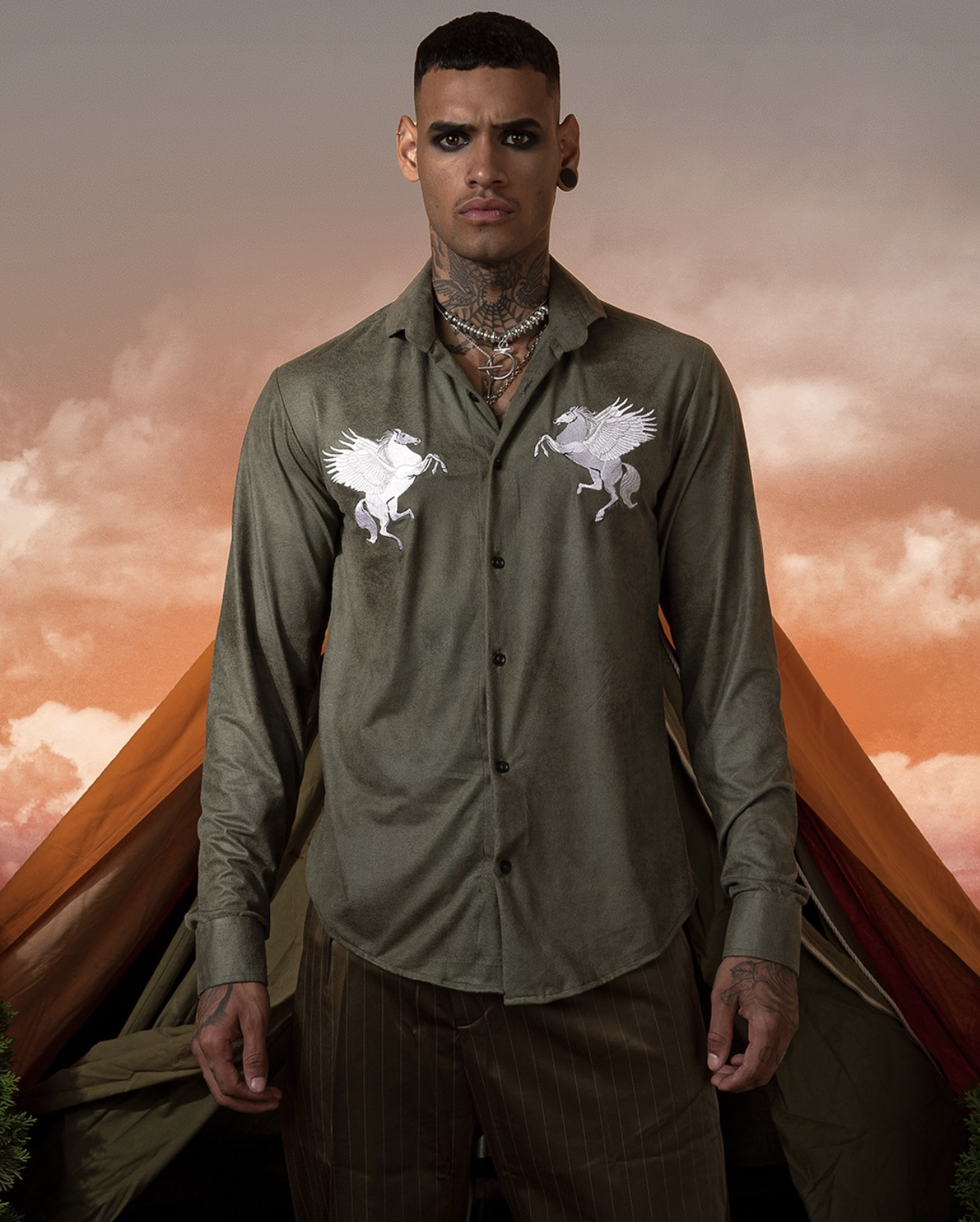 Camisa de gamuza , con bordado de Unicornio , cuello y corte Italiano. Inspirada en los Caballeros del Zodíaco.
